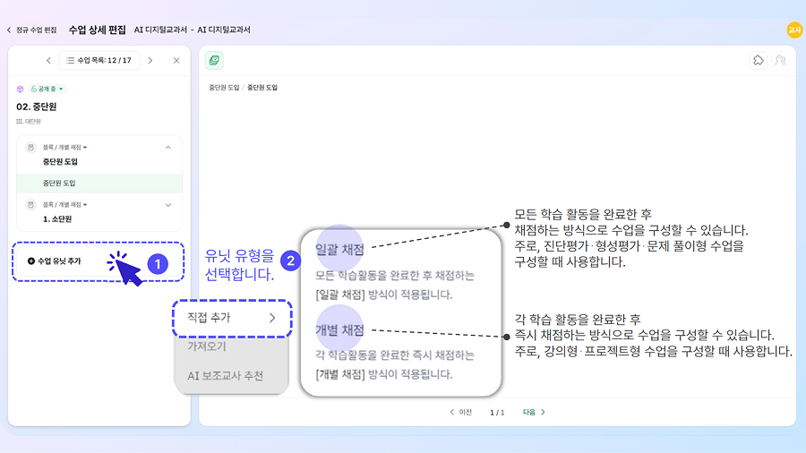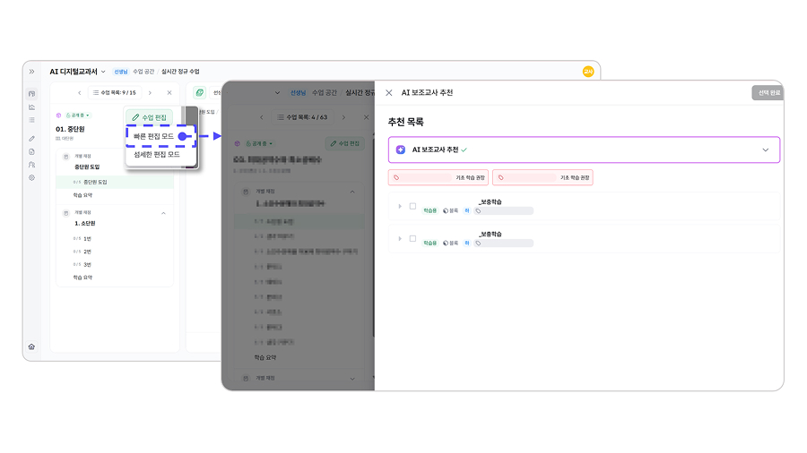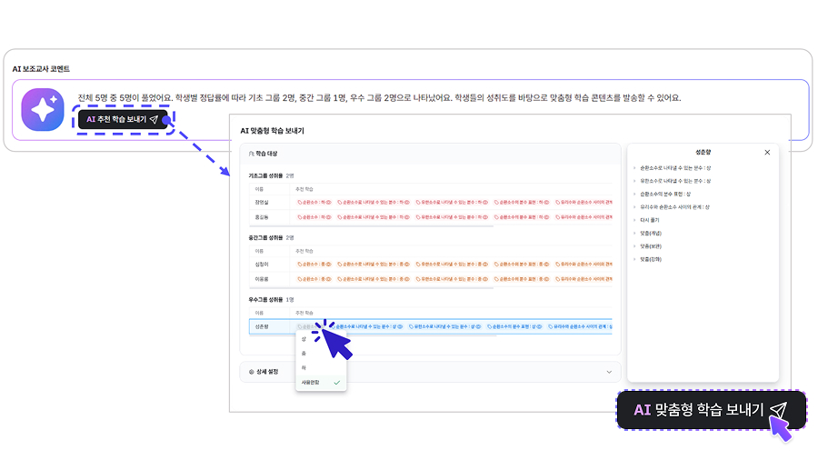 AI 보조교사가 학습 데이터를 분석하여 추천한 학습으로 간편하게 수업을 재구성해 보세요.