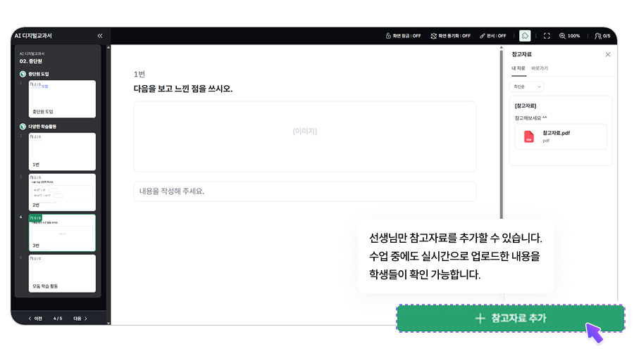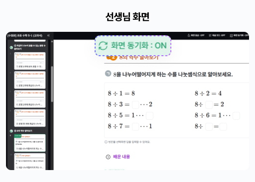 선생님과 학생의 화면을 동기화할 수 있어 수업 속도에 맞춘 원활한 수업이 가능해요.