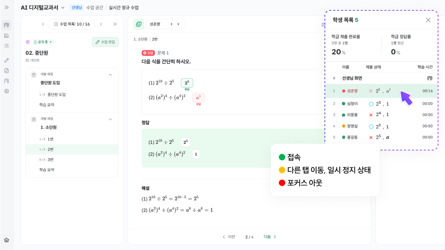학생들의 접속 상태, 참여 현황, 제출 답안을 실시간으로 확인하여, 즉각적인 피드백을 제공할 수 있어요.
