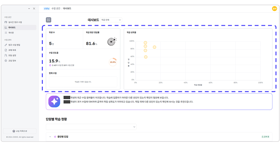 대시보드로 전체 학생들의 수업 현황 및 차시별 학습 결과를 한눈에 보고,