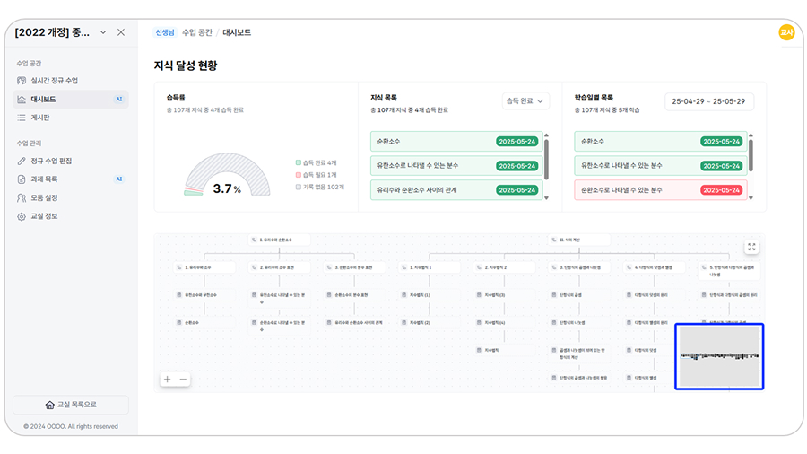 학생 개인별 대시보드에서 지식태그와 학습맵을 통해, 습득한 지식 목록을 직관적으로 파악할 수 있어요.